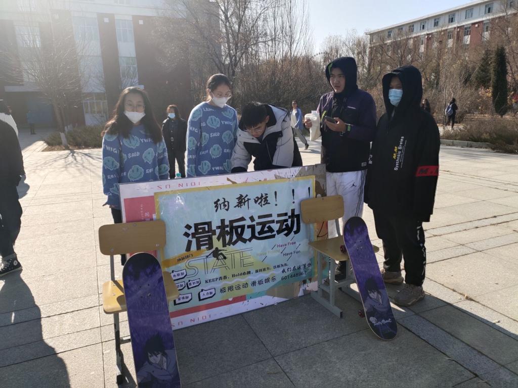 为了丰富同学们的课余生活,让新同学快速融入大学生活中,2020年10月29日滑板社在九思廊开展了纳新活动。