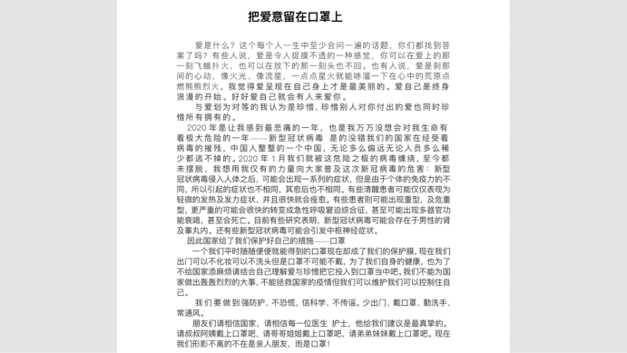 管理工程系学生会于6月15日—17日利用线上平台,开展“把爱意留在口罩上”主题征文比赛。